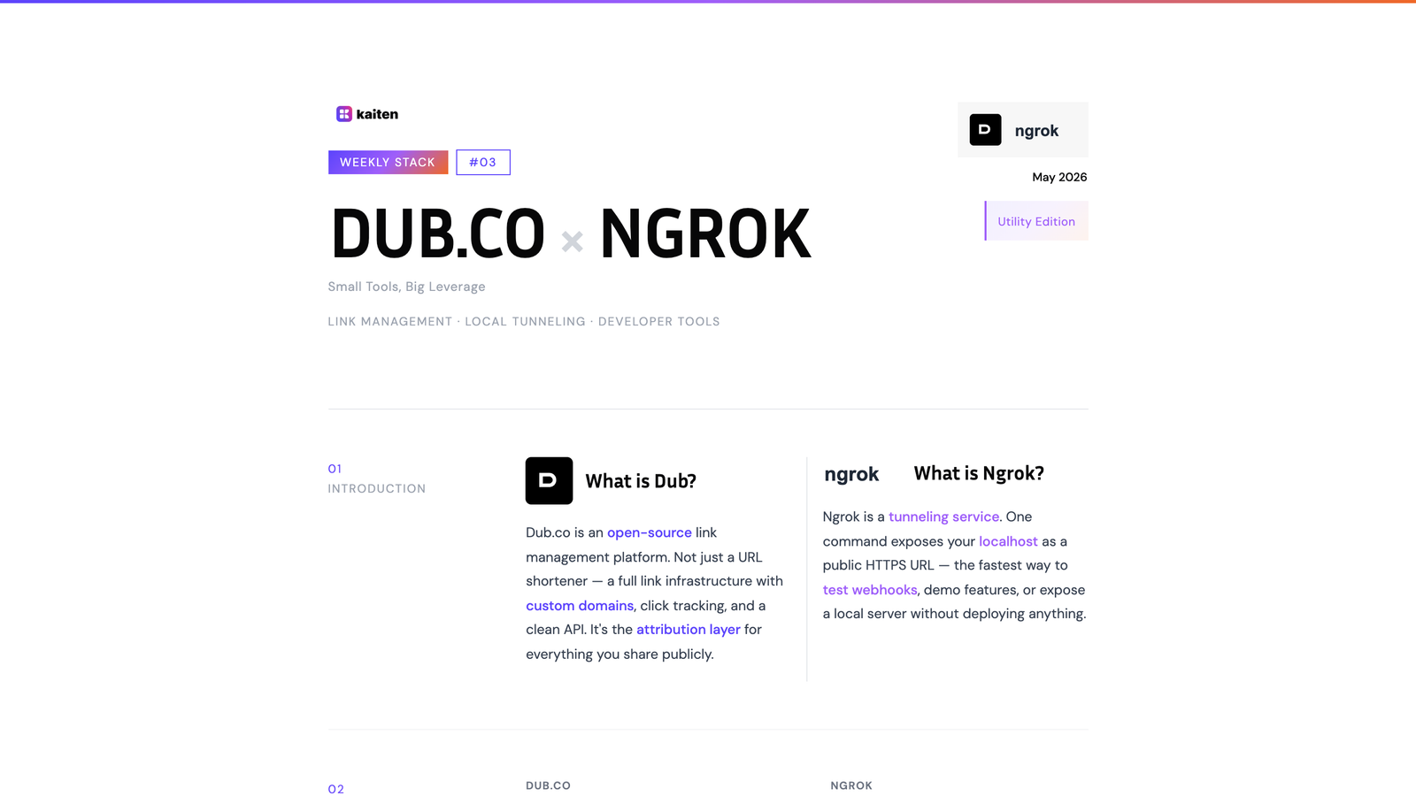 A special double-edition Weekly Stack covering two small tools that punch way above their weight: Dub.co for tracking every link you share, and Ngrok for exposing your local server to the world.